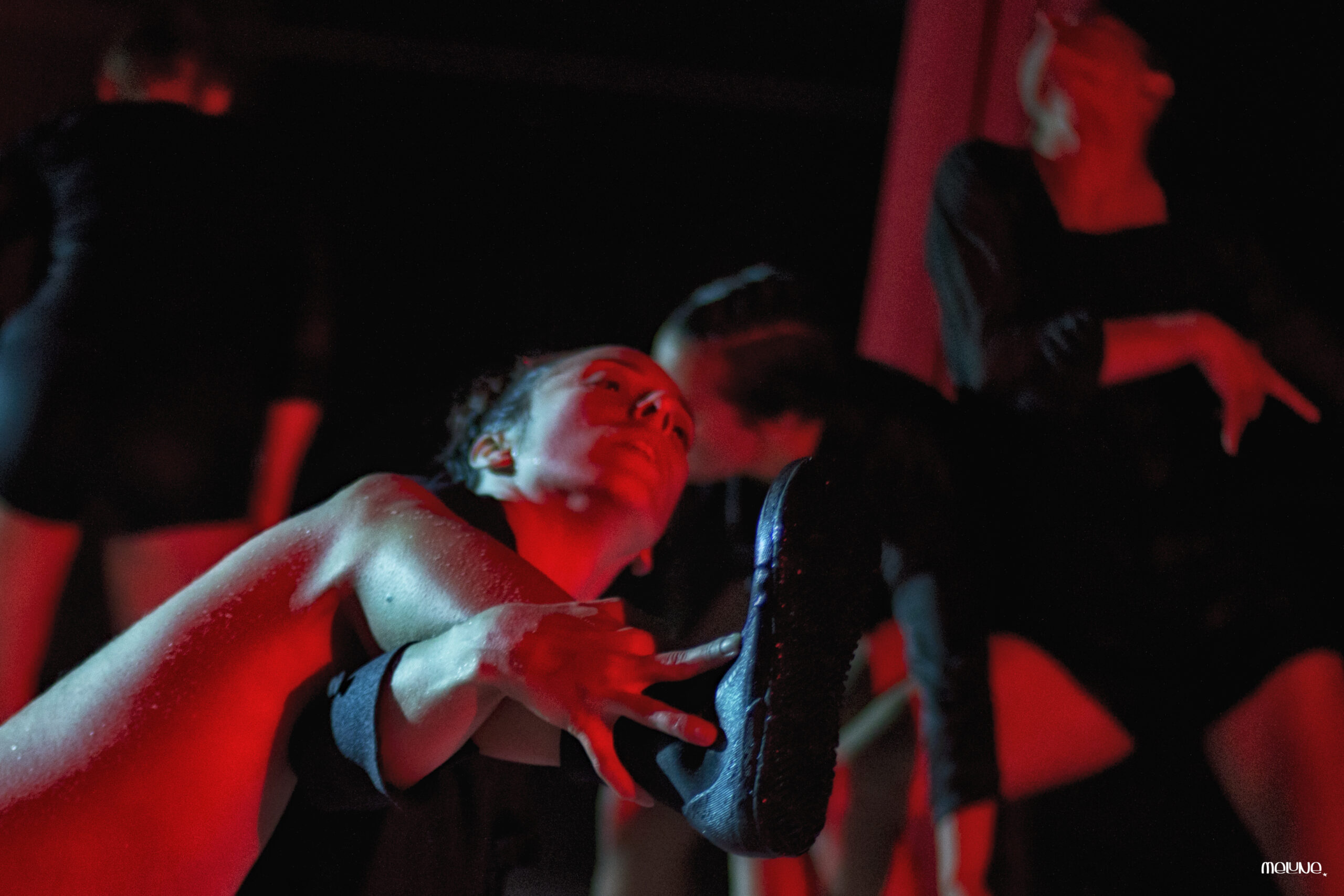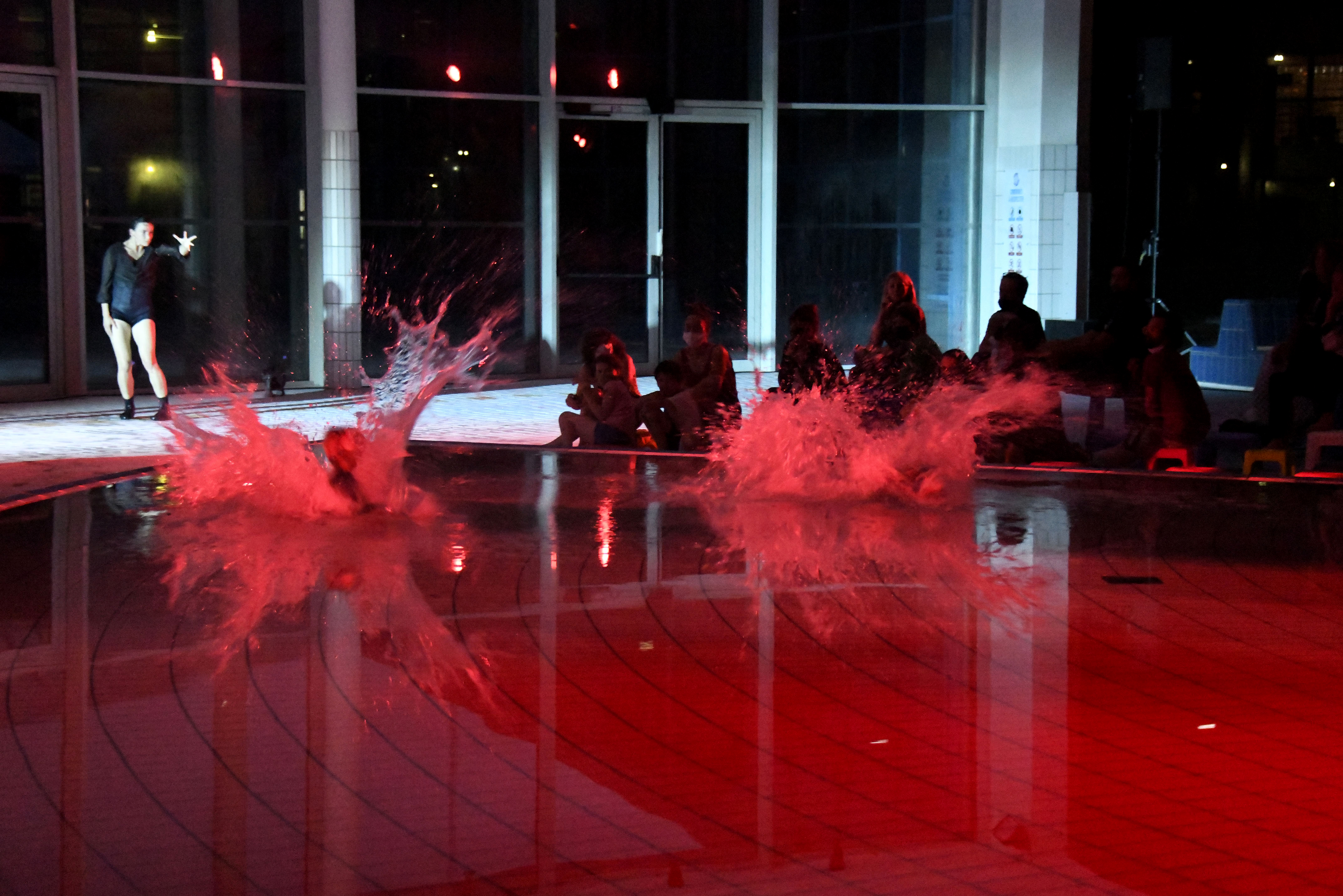 We shift to a different pool; shallower, smaller, more intimate. Here, the dancers slip all the way into the water and we can see their facial expressions as they give in to the splash-fight delight of childhood. The tone shifts again when a game of climbing out and falling into the pool intensifies until it is no longer a game. Blood seeps into the water and all of a sudden the dancers are drowning, gasping, flailing, one after another, again and again, before they re-emerge as fantastic marine monsters.