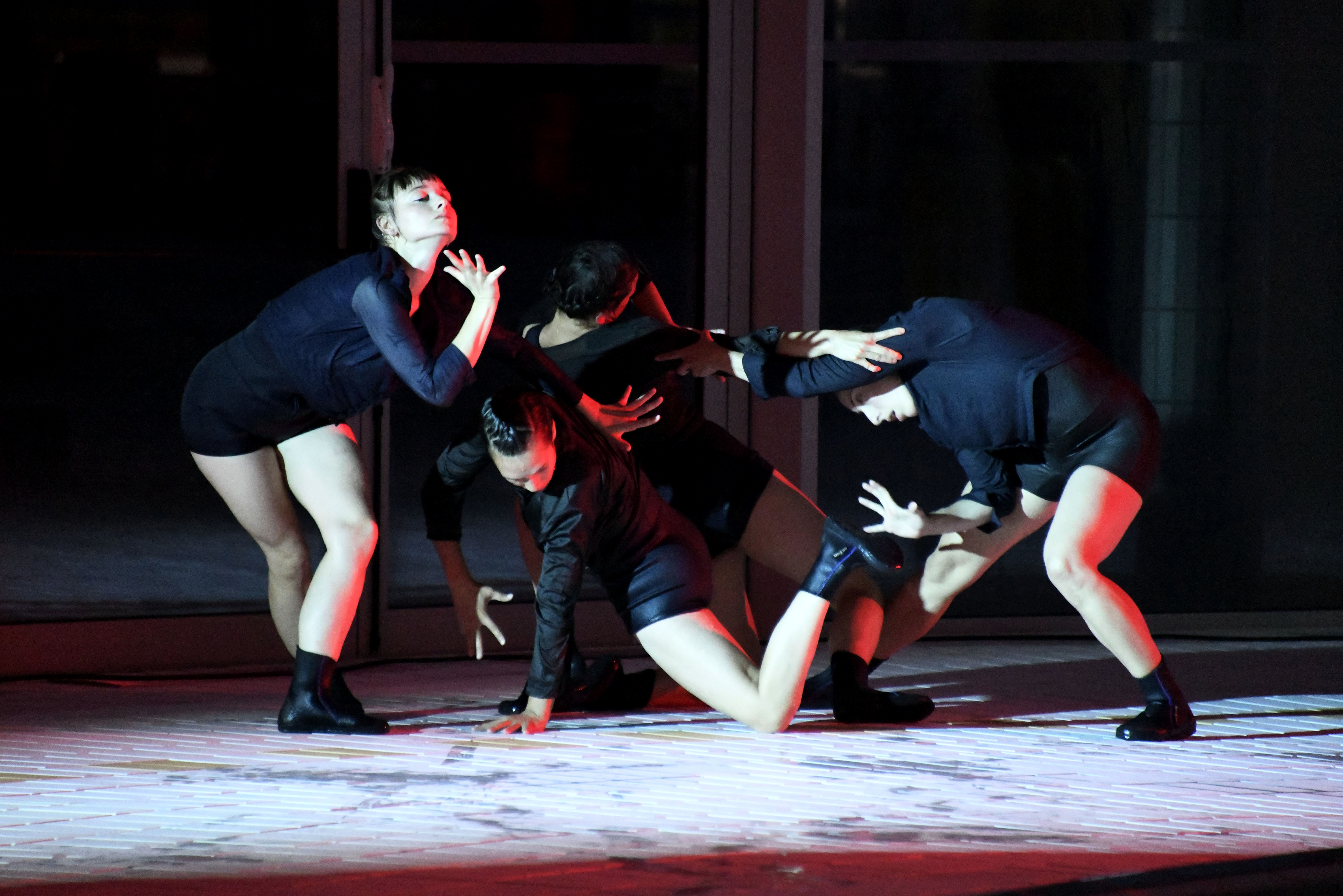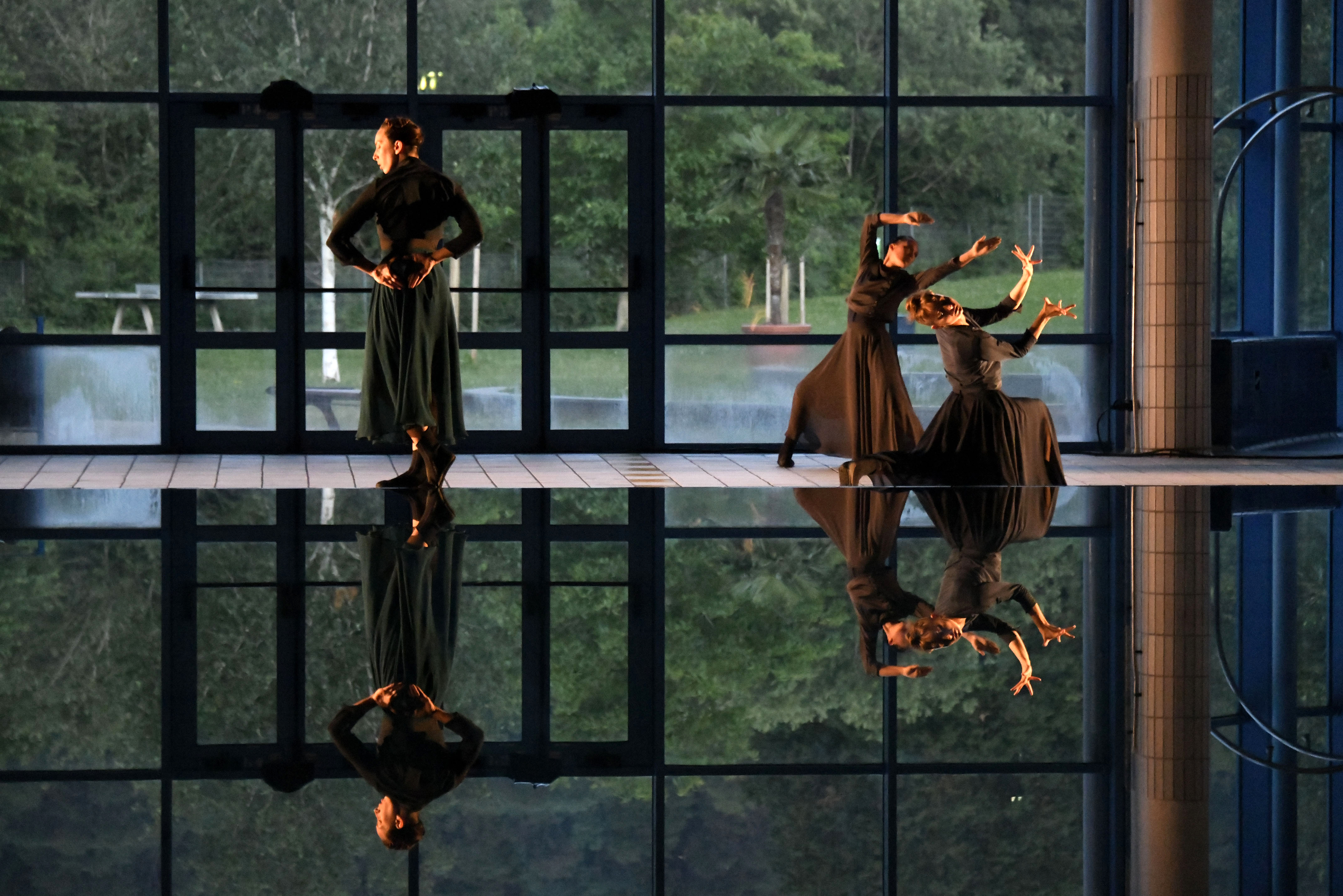 Mist drifting across an empty swimming pool as the audience enters barefoot; slightly perturbed, mostly charmed, by this already atypical experience. Then come the dancers. Four serene, dark-clad women who pace to the far side of the water and, each in her own space, start to move. Varying combinations of 1, 2, 3 and 4 perform sections of water-inspired choreography, as the untouched swimming pool offers up perfect reflections at their feet, four upside-down figures who join the dance. There is no physical contact between bodies or with the water, until at last the separation is broken by a splash, and the pensive mood becomes playful.