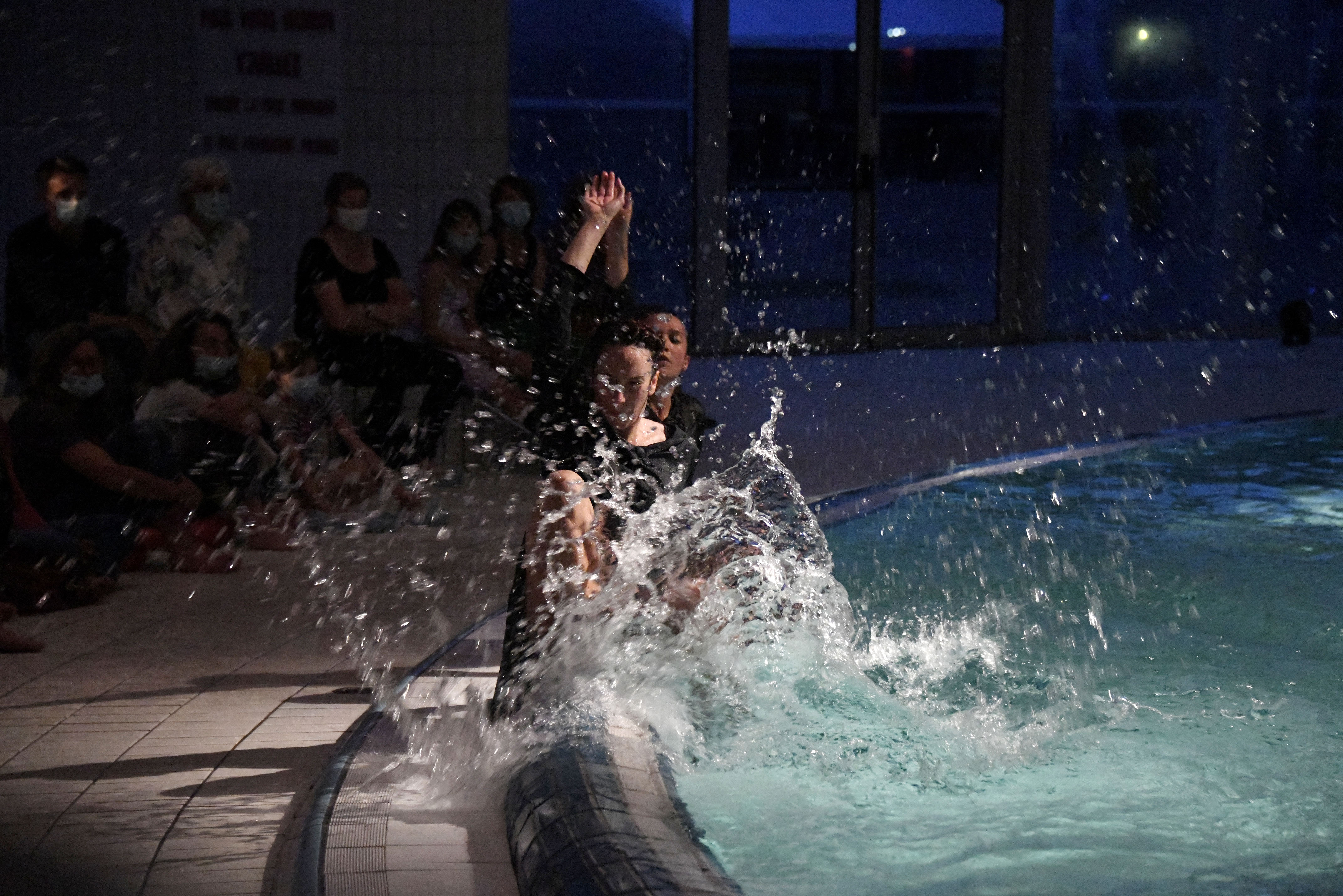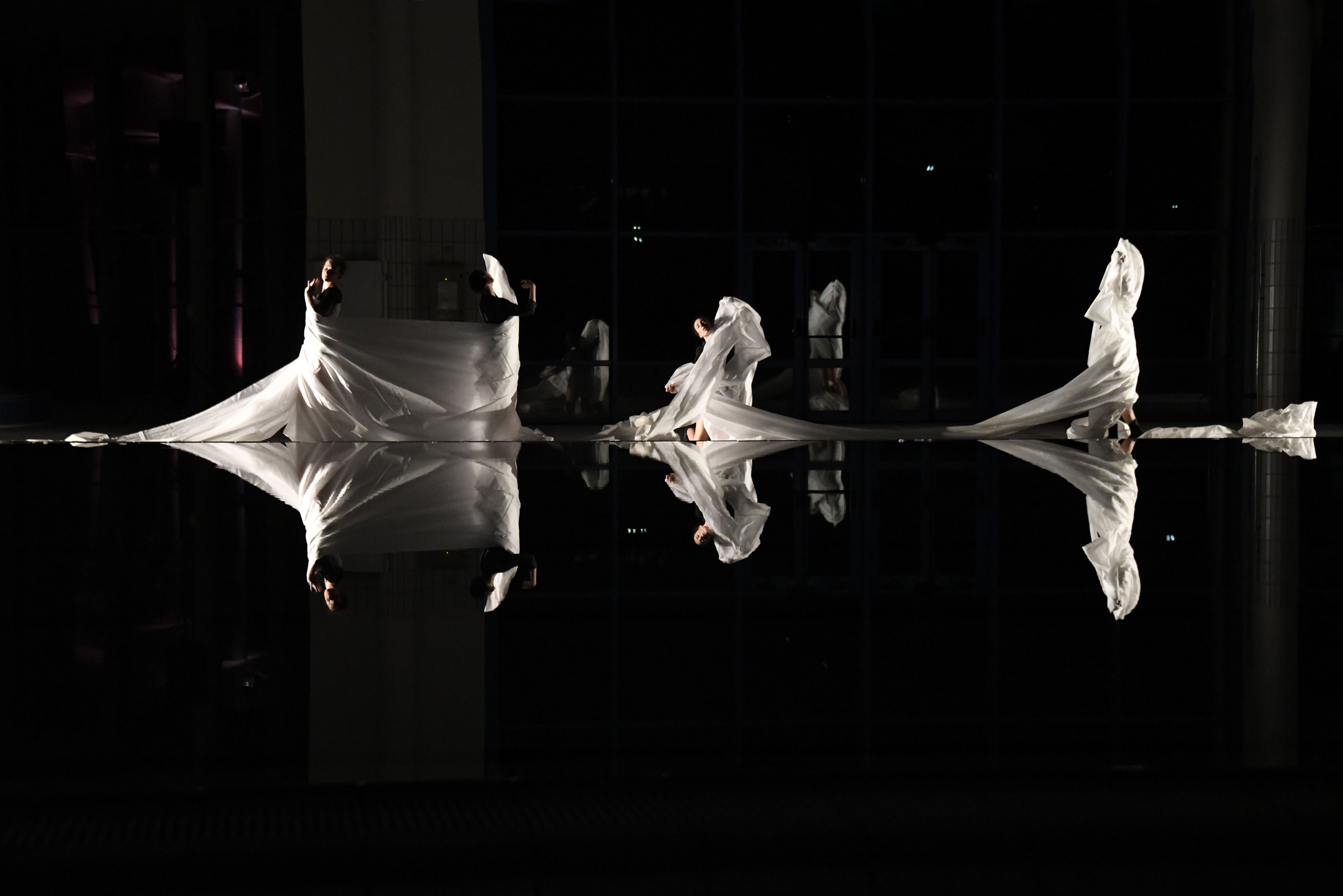 We come back to the large swimming pool for a sequence with an immense length of white cloth that shrouds, engulfs, connects – a sail? a veil? or the representation of a wave that undulates between the dancers, sometimes obscuring, sometimes overwelming them. At last it is heaped into sculptural mounds along the pool’s edge, and the dancers slide into the water to float motionless, lifeless or just peaceful. Heavy silence falls until, timid then tumultuous, the applause erupt.